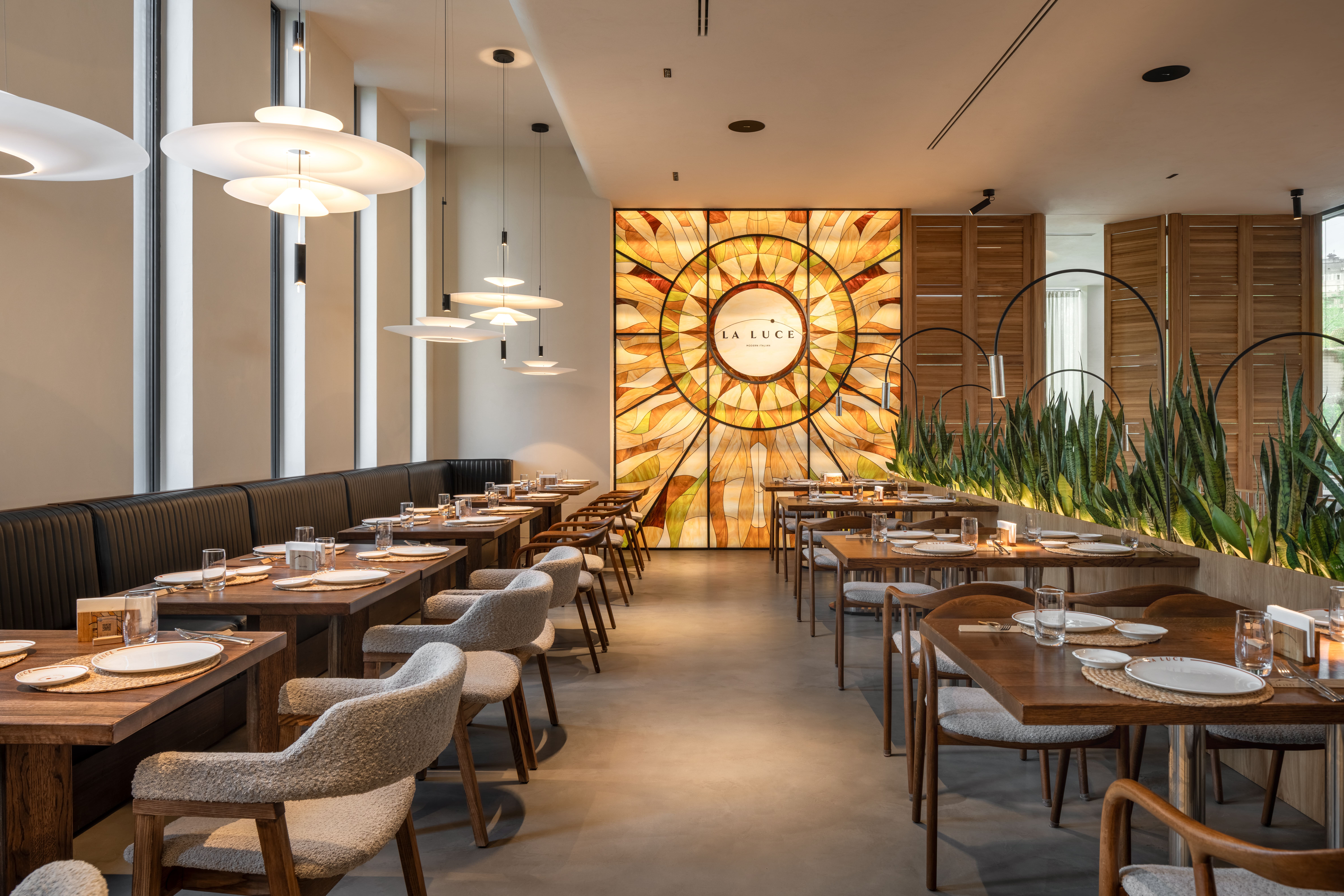 Оливковий сад: Живі оливкові дерева у масивних горщиках, що додають інтер’єру середземноморського духу та слугують природними розділювачами зон.