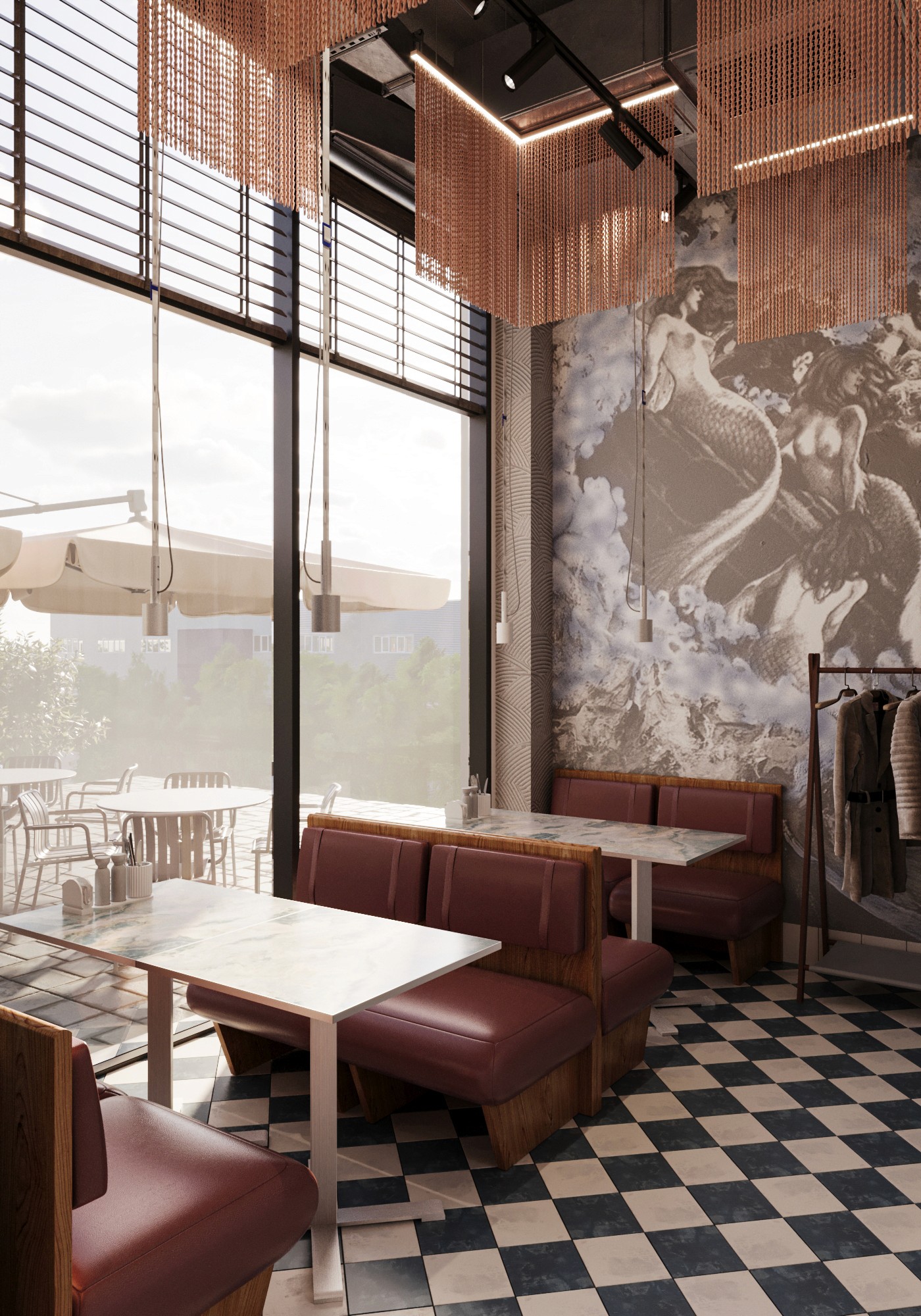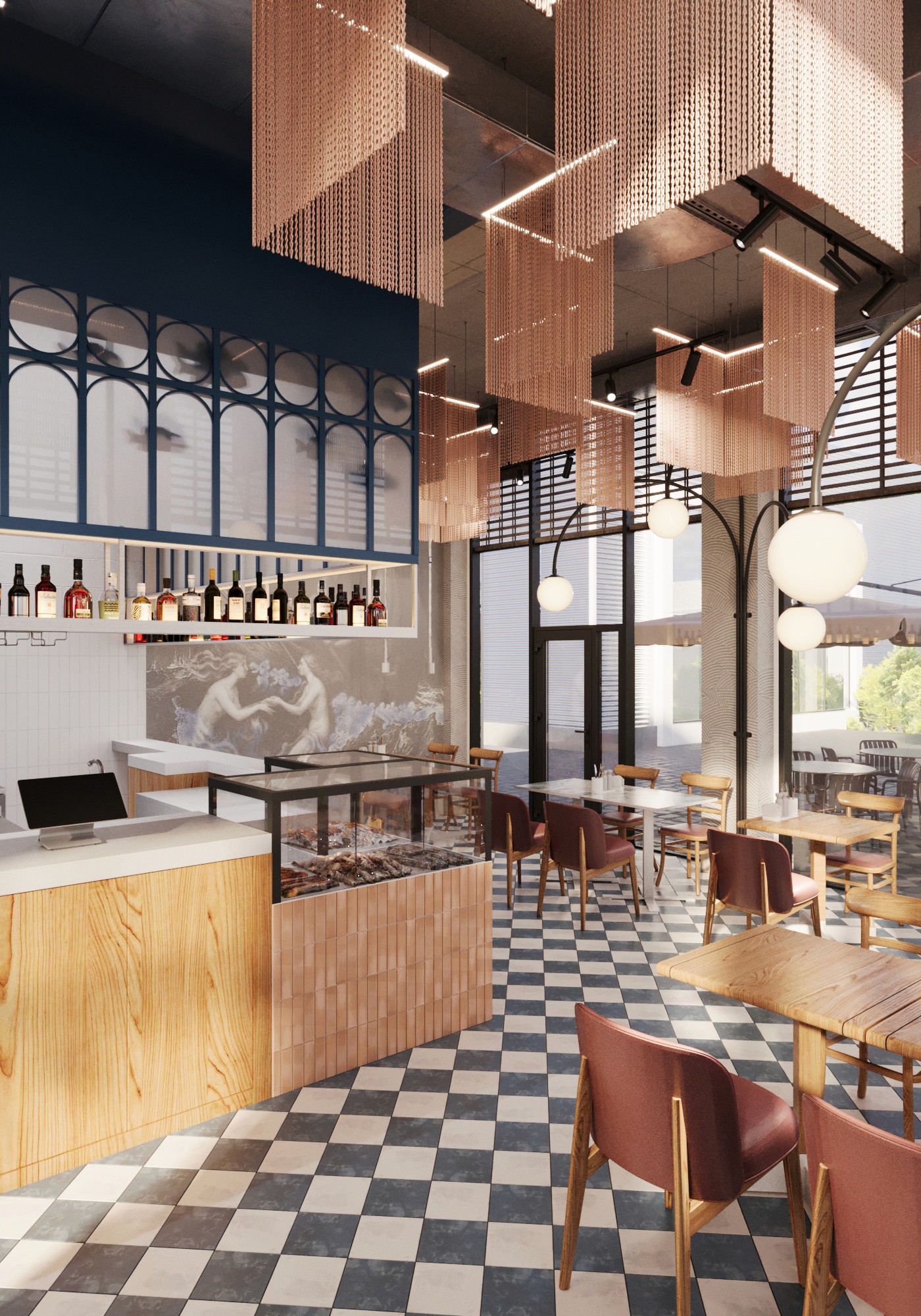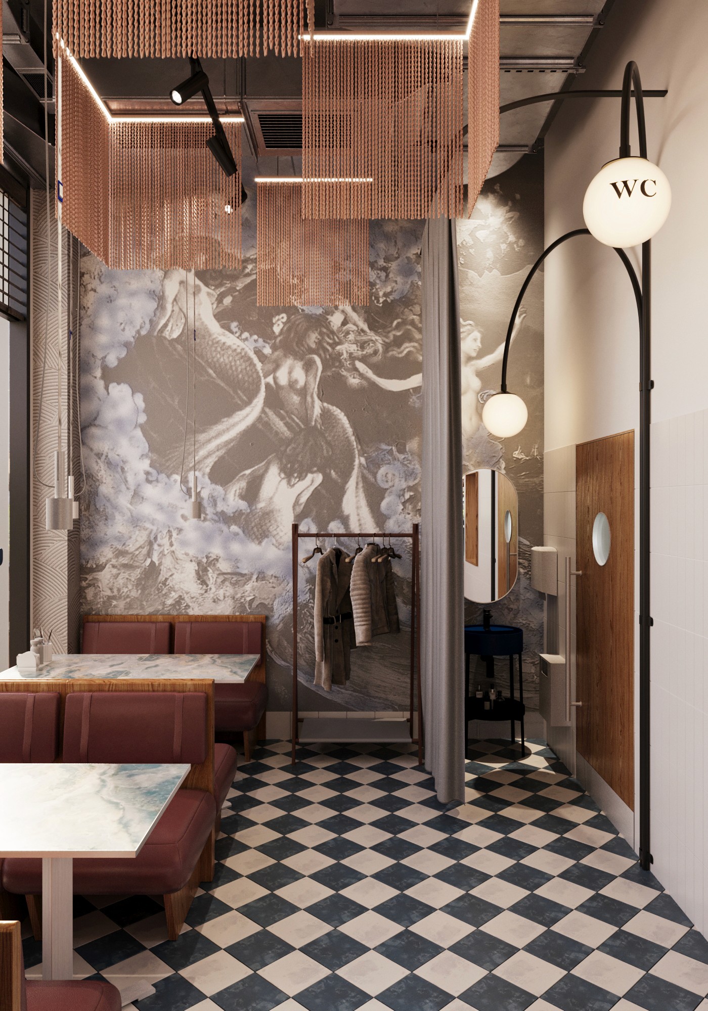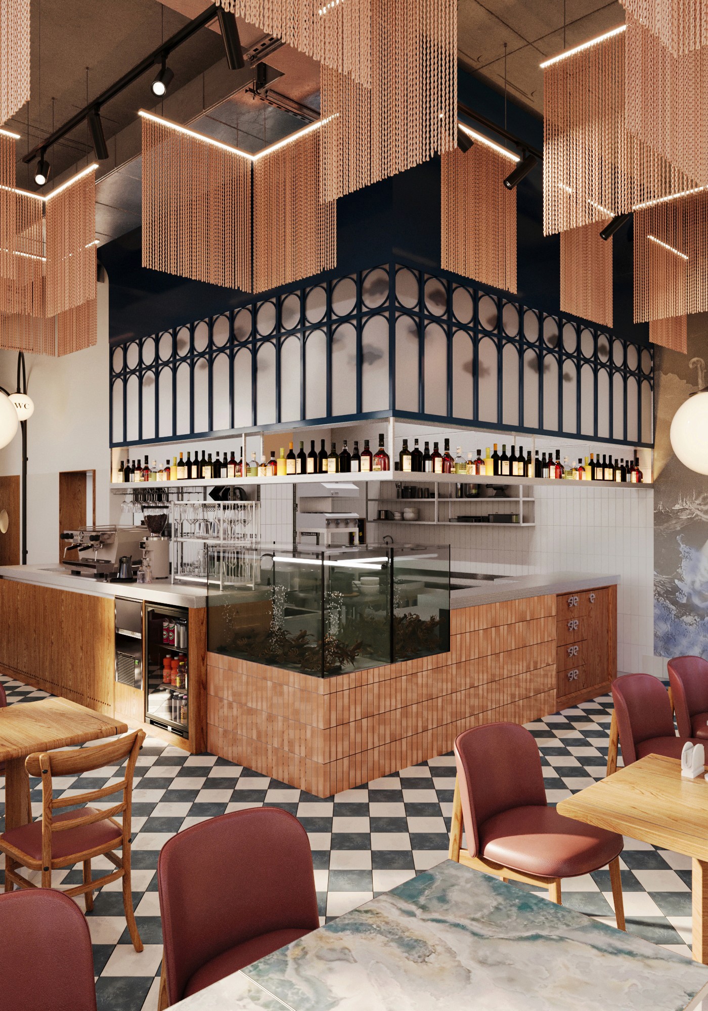 Інтер’єр продуманий так, щоб гість міг повністю зануритися в атмосферу моря. Відкрита кухня стає композиційним центром простору: живий процес приготування додає динаміки й наповнює зал відчуттям щирості та відкритості. Концепція вибудувана на морській естетиці — натуральні текстури, глибокі сині й бірюзові відтінки, м’яке світло та продумана акустика створюють настрій прибережного простору. Камерність підсилює цей ефект: низька стеля й компактний масштаб роблять інтер’єр затишним, майже особистим.