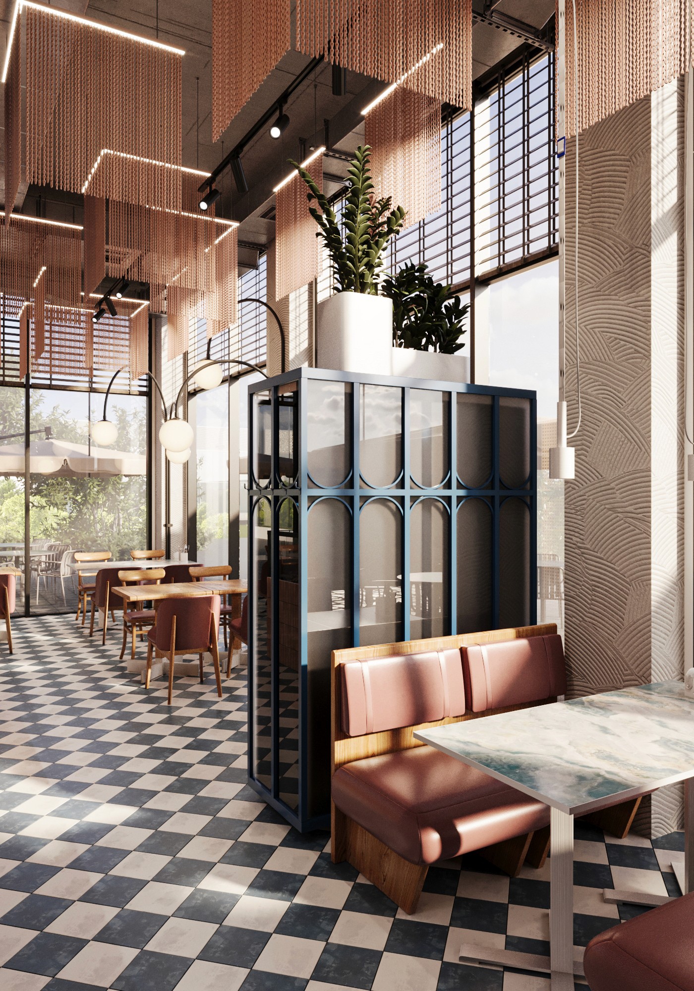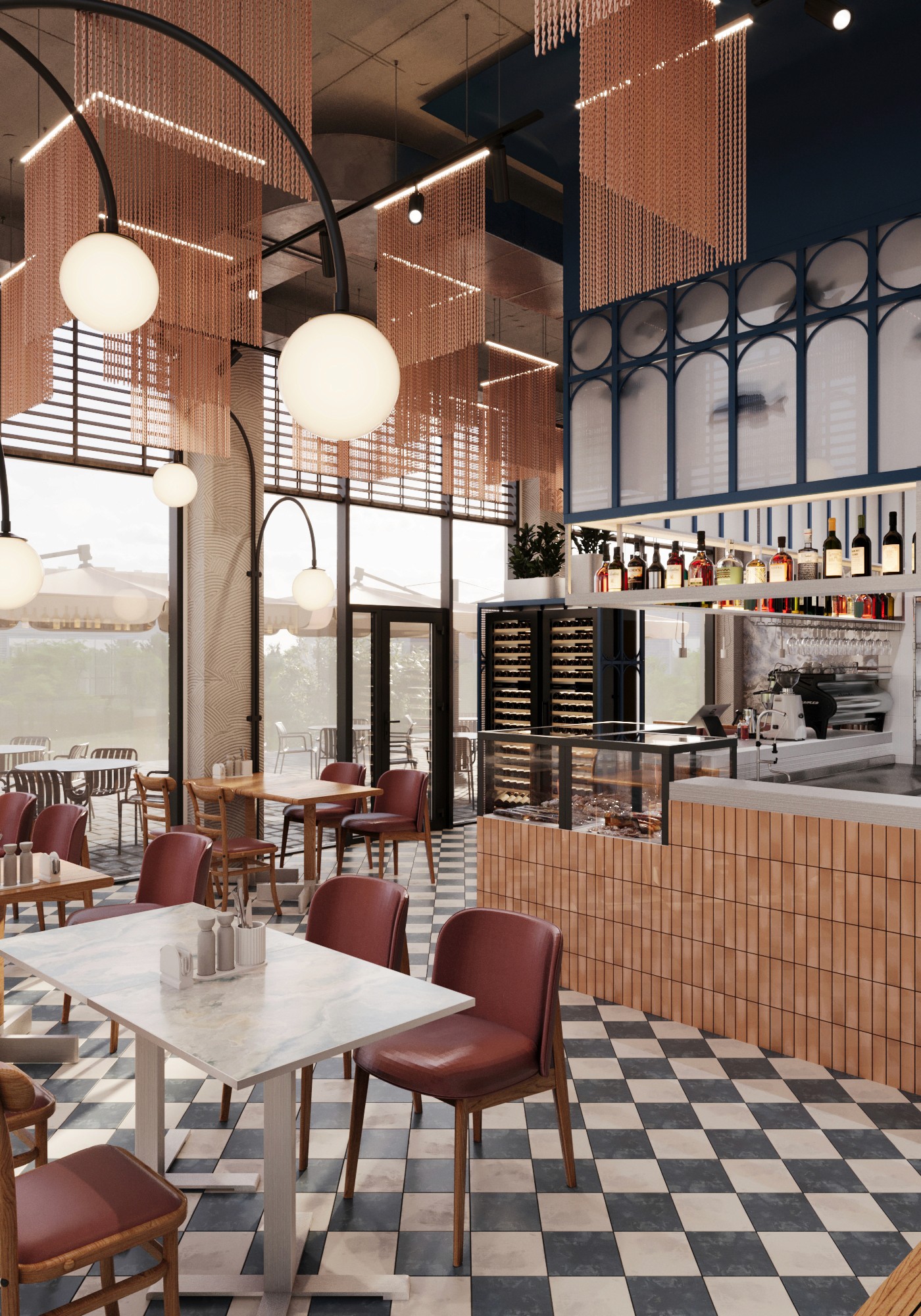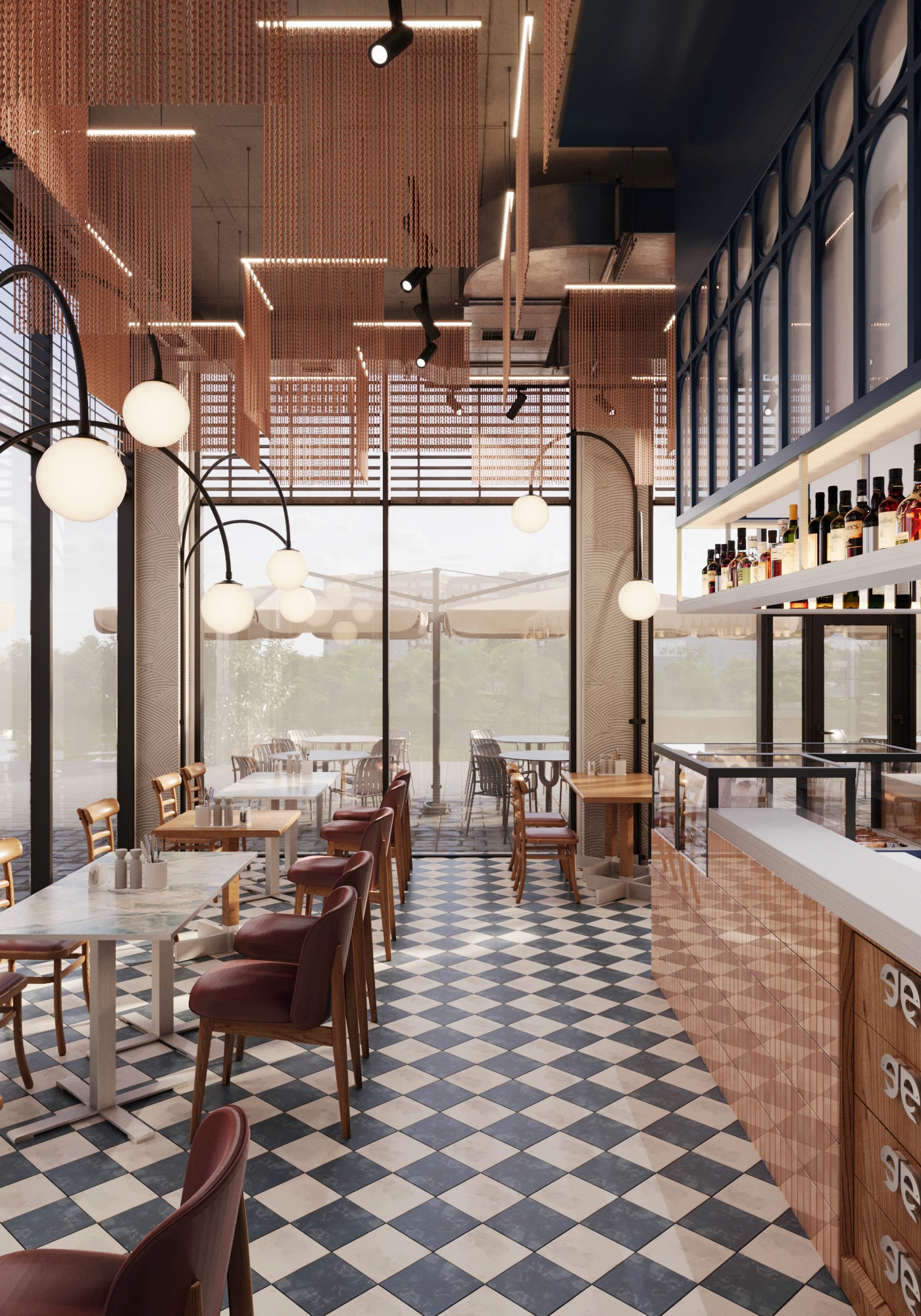Інтер’єр продуманий так, щоб гість міг повністю зануритися в атмосферу моря. Відкрита кухня стає композиційним центром простору: живий процес приготування додає динаміки й наповнює зал відчуттям щирості та відкритості. Концепція вибудувана на морській естетиці — натуральні текстури, глибокі сині й бірюзові відтінки, м’яке світло та продумана акустика створюють настрій прибережного простору. Камерність підсилює цей ефект: низька стеля й компактний масштаб роблять інтер’єр затишним, майже особистим.
