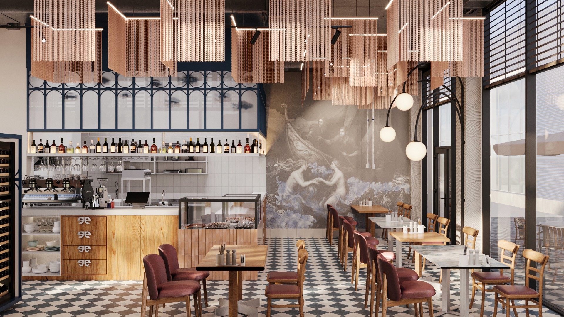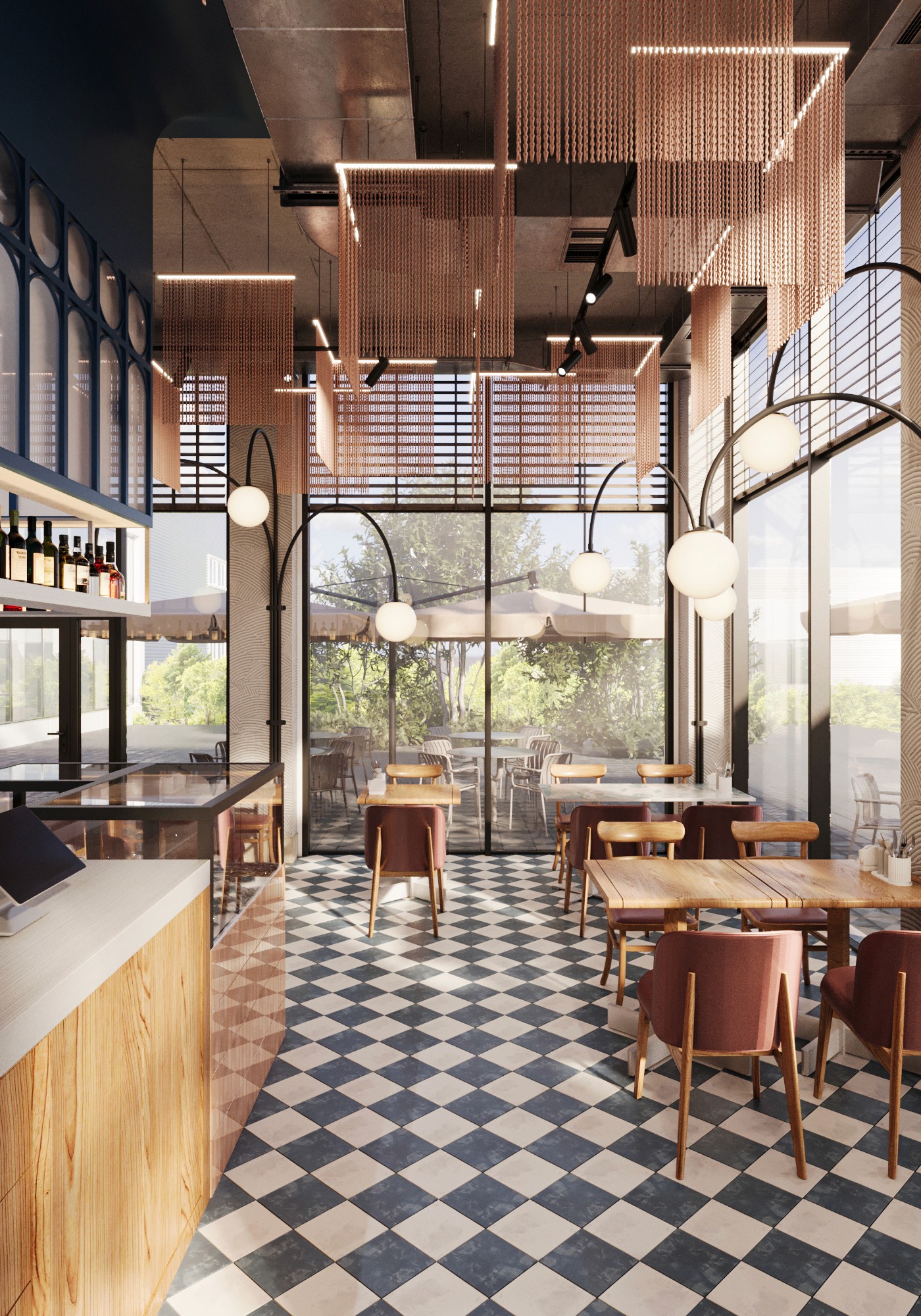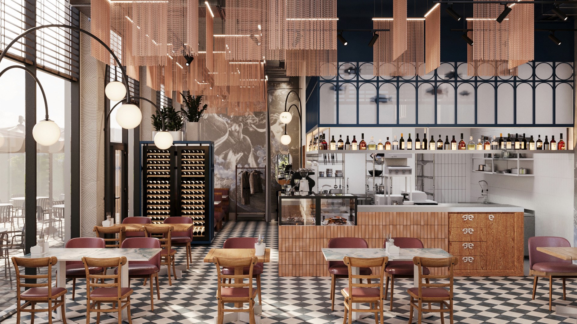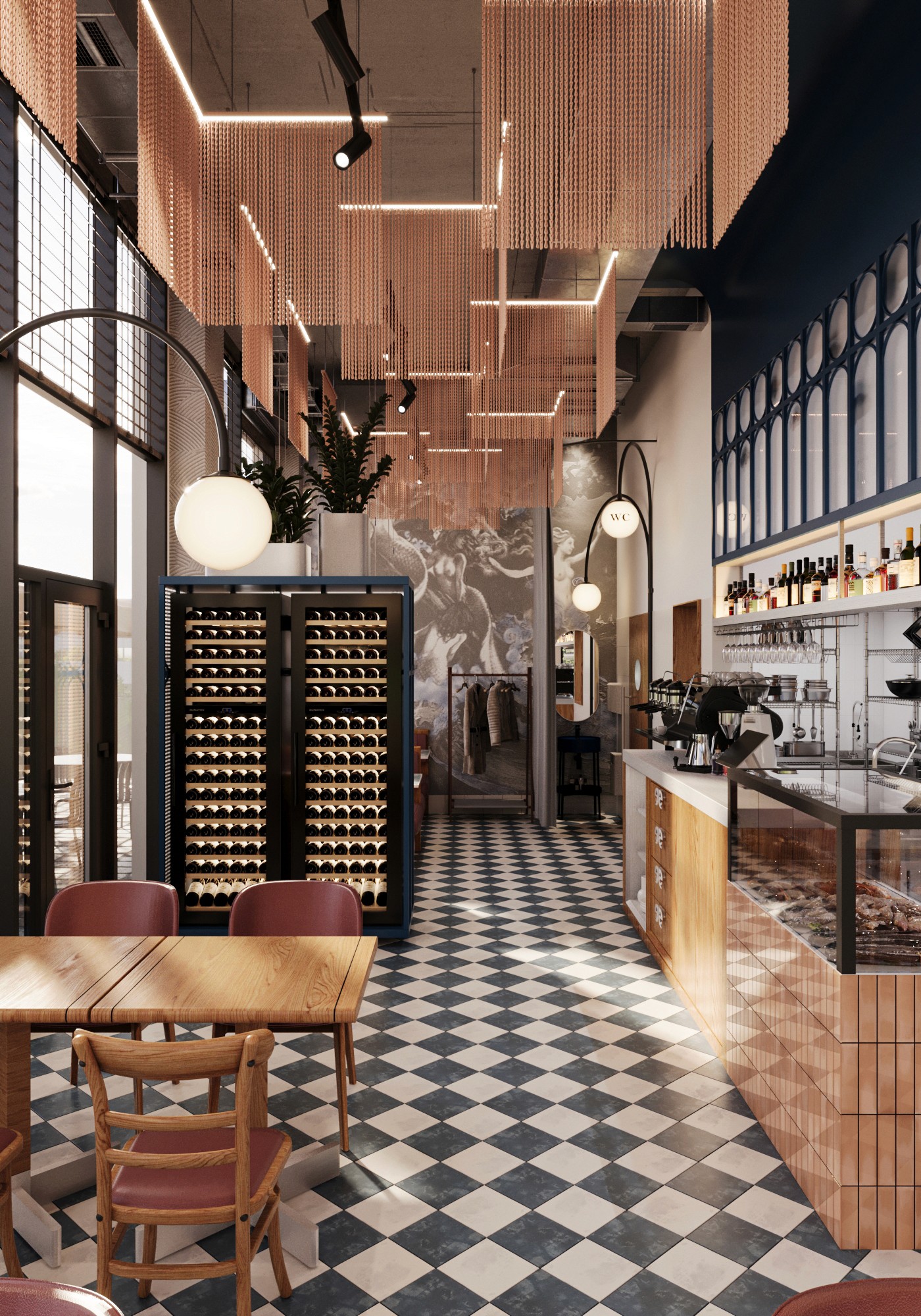 Інтер’єр продуманий так, щоб гість міг повністю зануритися в атмосферу моря. Відкрита кухня стає композиційним центром простору: живий процес приготування додає динаміки й наповнює зал відчуттям щирості та відкритості. Концепція вибудувана на морській естетиці — натуральні текстури, глибокі сині й бірюзові відтінки, м’яке світло та продумана акустика створюють настрій прибережного простору. Камерність підсилює цей ефект: низька стеля й компактний масштаб роблять інтер’єр затишним, майже особистим.